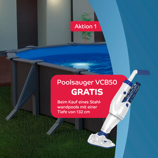 Beim Kauf eines Stahlwandbeckens mit 132 cm Tiefe erhalten Sie von uns den Akku-Poolsauger „GRE ELECTRIC VAC PLUS“ im Wert von 269,90 € automatisch kostenlos dazu.