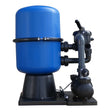 Système de filtre à sable hawaïen fabriqué en Allemagne avec récipient filtrant en deux parties de 400 mm (diamètre) en plastique fibre de verre, anneau de serrage en acier inoxydable et pompe filtrante de type : SPS 100-1 8 m³/h, avec vanne 6 voies. Pour piscines d'une capacité d'eau jusqu'à 48 m³.