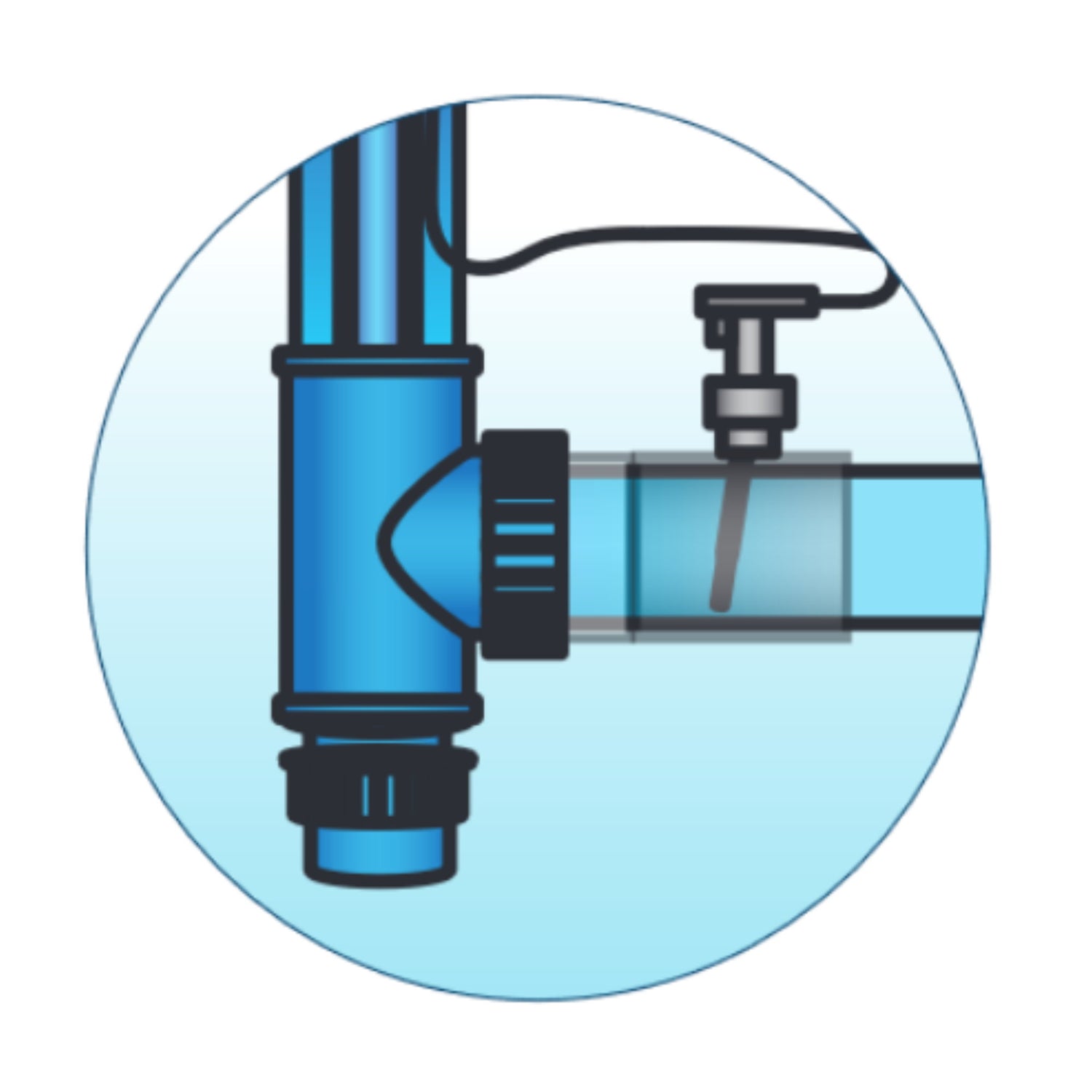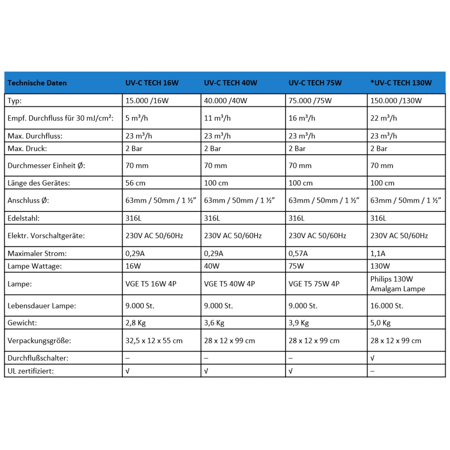 Die Amalgam Version (Tech UV-C 130W) besitzt einen Durchfluss Schalter, der die Lampe abschaltet, wenn der Durchfluss zu schwach ist. Die Amalgam Lampe ist unempfindlich gegen Schwankungen der Wassertemperatur und bewirkt eine konstante, starke Strahlung. Amalgam UV-C gilt als das stärkste UV-C-Licht, das auf dem UV-C Markt erhältlich ist. Max. Druck: 2 Bar. Achtung! Erdung.