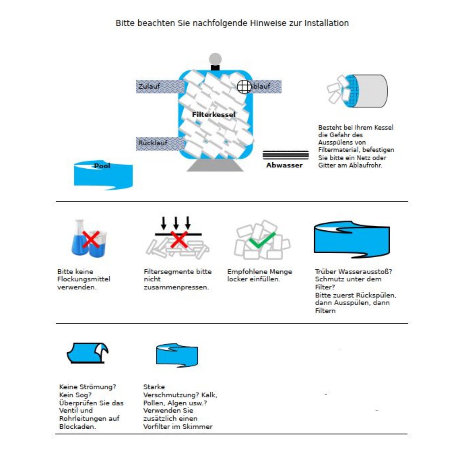 Hinweis: Bitte beachten Sie vor der Installation des Filtermaterials, die unter "Verfügbare Downloads" hinterlegte Installationsanleitung. Bitte verwenden Sie kein Flockungsmittel oder Wasserpflegeprodukte, die Flockungsmittel enthalten. Das Filtermaterial kann auch für Becken mit Salzelektrolyse angewendet werden. Die beiden Schichten (blau & weiß) des Filtermaterial sind nicht fest miteinander verbunden. Beim Einfüllen können sich diese voneinander lösen.