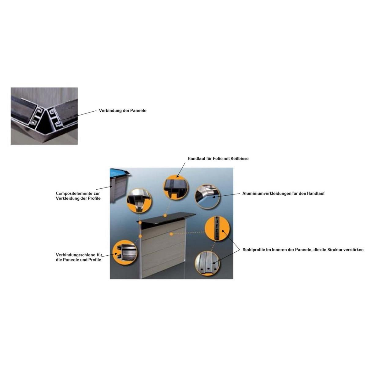 Dank des Stecksystems mit Aluminiumschienen wird das Becken im Handumdrehen aufgebaut, ohne Werkzeuge. Dadurch ist es möglich, das Becken in einem Zeitraum von 60 - 90 Minuten komplett aufzubauen.
