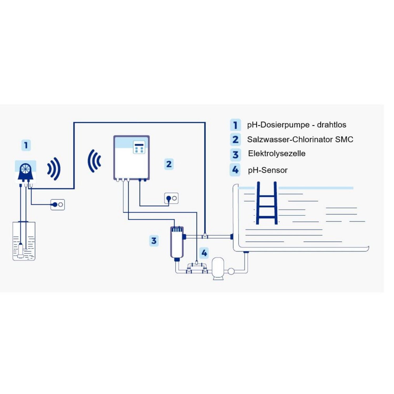Inklusive einer automatischen pH-Dosierpumpe. Diese ermöglicht es Ihnen, den pH-Wert mit einer mit dem Chlorinator verbundenen Elektrode zu messen und mittels der pH-Dosierpumpe automatisch zu korrigieren. Der Chlorinator misst den pH-Wert und sendet ein Steuersignal drahtlos an die Dosierungspumpe.