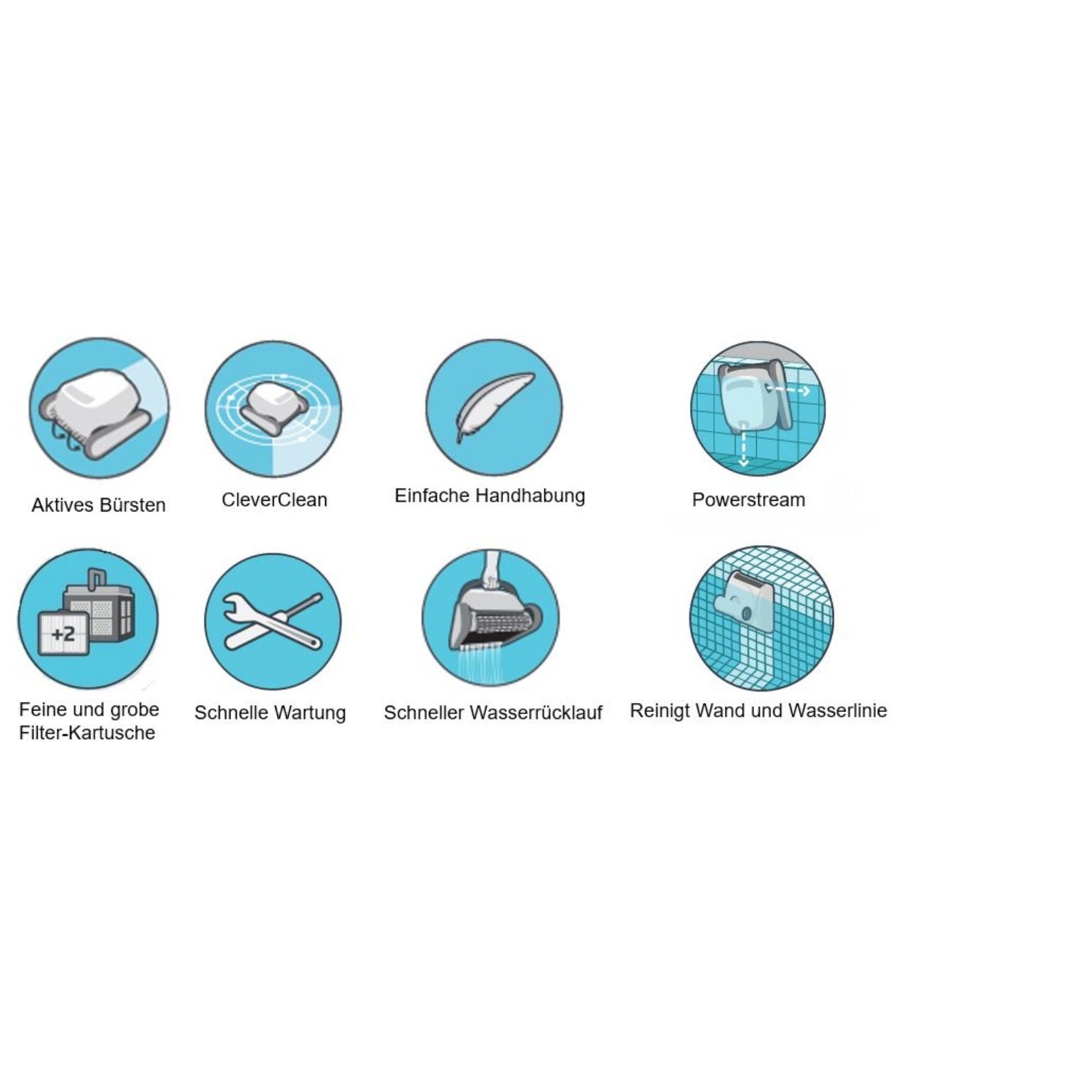 - Zykluszeit: ca. 2 Stunden Poolboden- und Wandreinigung