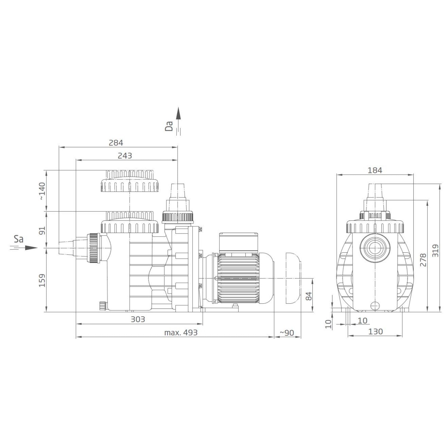 Schwimmbadwasser-Umwälzung in Filteranlagen, aufstellbar max. 2,0 m oberhalb oder max. 3,0 m unterhalb des Wasserniveaus.