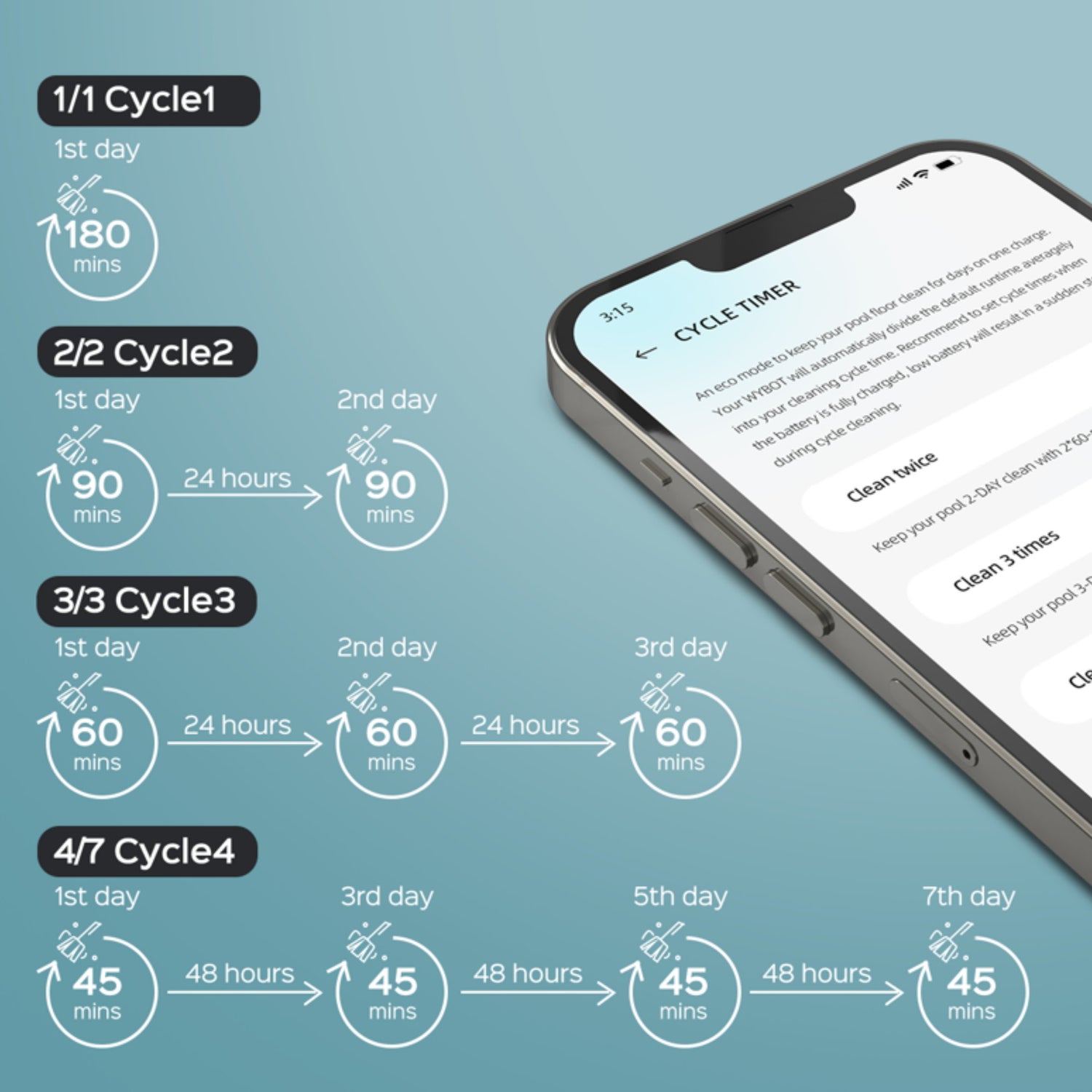 Über die App können Sie zwischen 1 x 120 Minuten, 2 x 60 Minuten, 3 x 40 Minuten oder 4 x 30 Minuten wählen, um den Reinigungszyklus exakt an Ihren Zeitplan anzupassen. -